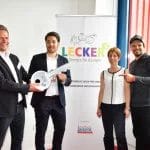 Dann kam der große Moment der Schlüsselübergabe durch den Vermieter und Förderer BEOS. Die Ausstattung der Küche ist von vielen Institutionen und Einzelpersonen enorm gefördert worden, so z.B. von der Aktion Mensch, vom Integrationsamt der Stadt Hamburg, von Firmen wie Profitabel, Schwarz&Grantz, Hagatec, MKN und dem Kooperationspartner Bösch Boden Spies, von der Scheck-Stiftung und vom Rotary Club Blankenese, vom Freundes- und Förderverein der Pestalozzi-Stiftung Hamburg und ganz aktuell noch von Gudrun Lüdicke vom Kirchenkreis Hamburg-Ost. Sie scheidet aus dem Berufsleben aus und verzichtet auf Abschiedsgeschenke; stattdessen bittet sie um Spenden für den Betrieb und hat dafür ein Plakat gezeichnet und aufgehängt. Der größte Dank gebürt wohl unserem Schirmherrn Steffen Henssler, der über seine Sendungen insgesamt 213.000 Euro an Spenden eingesammelt hat und mit seiner Medienpräsenz sehr öffentlichkeitswirksam für Lecker hoch drei ist.