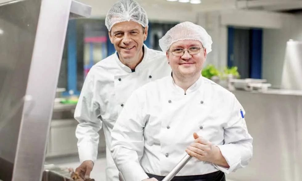 Matthias Riedl besucht mit Fernsehkoch Steffen Henssler den inklusiven Kita-Cateringbetrieb Lecker hoch drei – Dinners för Kinners.