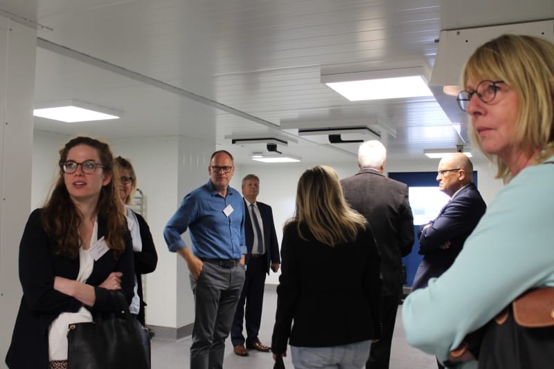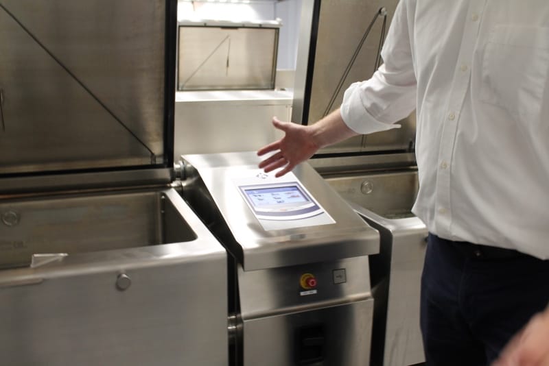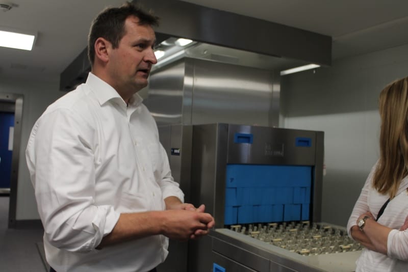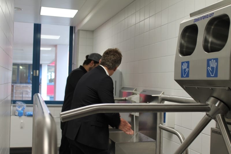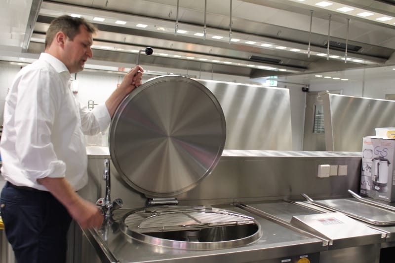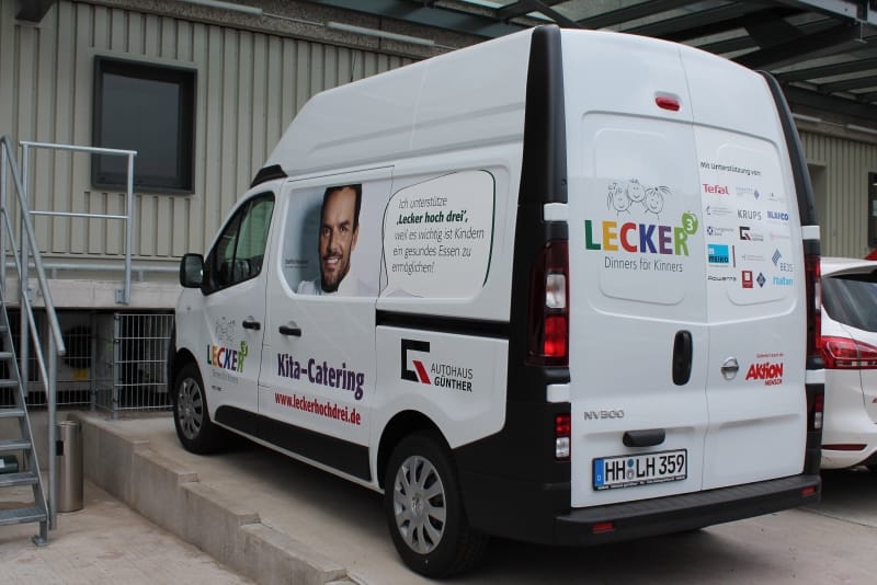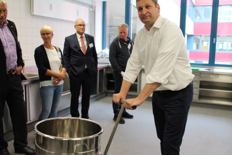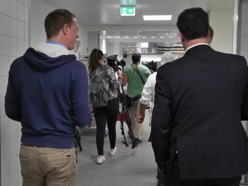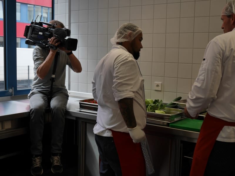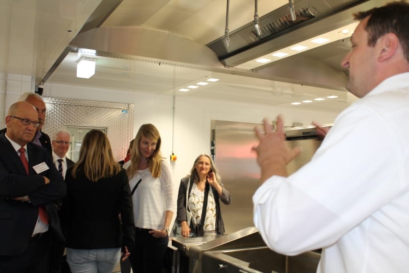 Bereits vor der eigentlichen Pressekonferenz war schon sehr viel los. Der NDR sowie RTL Nord filmten und interviewten Mitarbeiter; Steffen Henssler, unser Schirmherr, besichtigte die Küche zusammen mit Geschäftsführer Kai Gosslar und dem Küchenplaner Herrn Meissner. Auf der sehr gut besuchten Pressekonferenz berichtete Hr. Gosslar über den Weg von der Idee bis zur Entstehung von Lecker hoch drei und über die Zielsetzungen: Der Betrieb wird ungefähr 50 neue Arbeitsplätze für Menschen mit Behinderung schaffen. Die Arbeitslosigkeit bei dieser Zielgruppe liegt bei 12 %. Gleichzeitig ist es wichtig, den Kindern in Kitas gesundes und leckeres Essen anzubieten, da in diesem Lebensabschnitt Ernährungsgewohnheiten geprägt werden. Durch den Einsatz des Cook&Chill Verfahrens bleiben wichtige Nährstoffe erhalten, das Gemüse bleibt knackig und behält seine Farbe. Bei Lecker hoch drei hat Hygiene eine wichtige Priorität, alle Mitarbeiter müssen durch eine Hygieneschleuse. Wie hamburg work insgesamt setzt auch Lecker hoch drei auf Nachhaltigkeit. In der Küche wird z. B. sehr viel Energie verbraucht, Lecker hoch drei bezieht dafür Ökostrom.