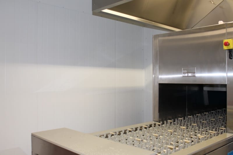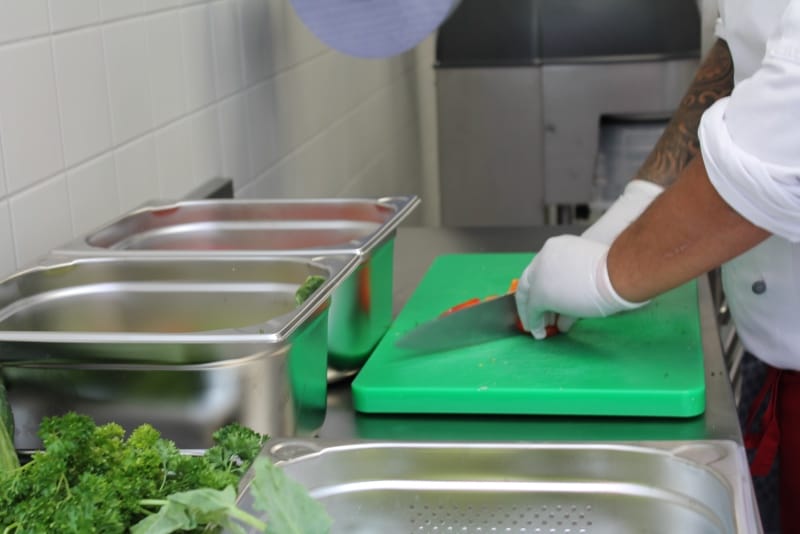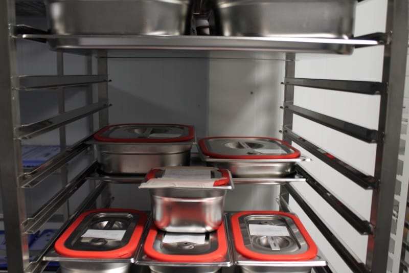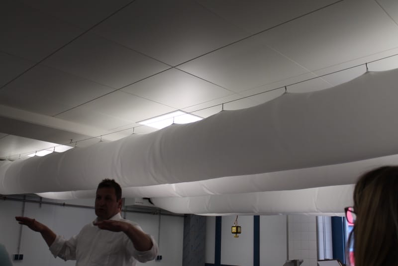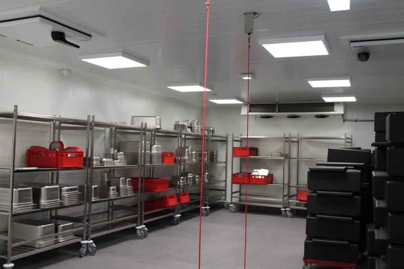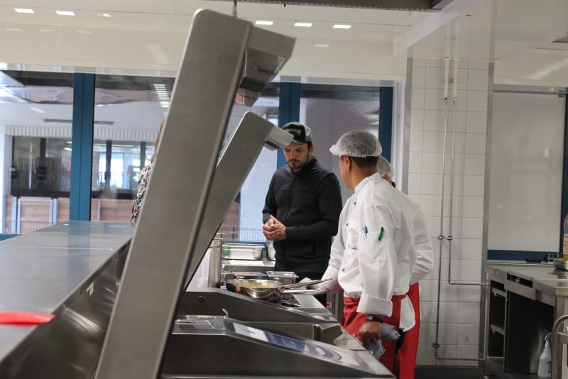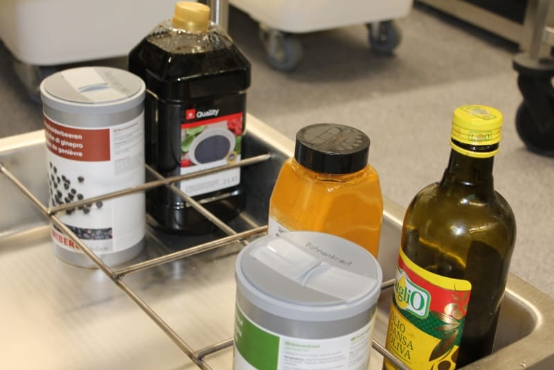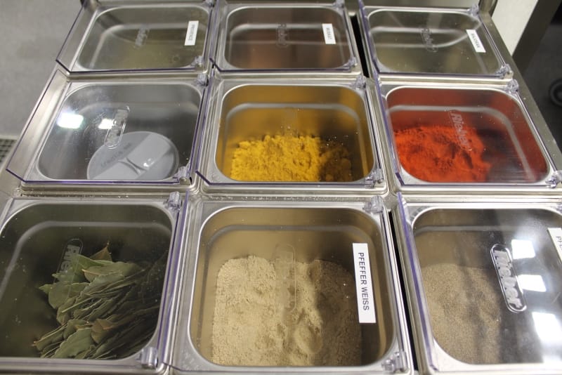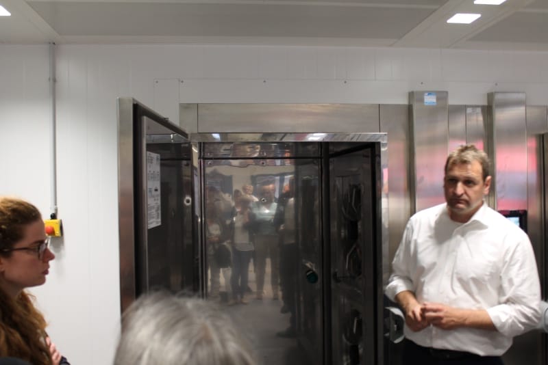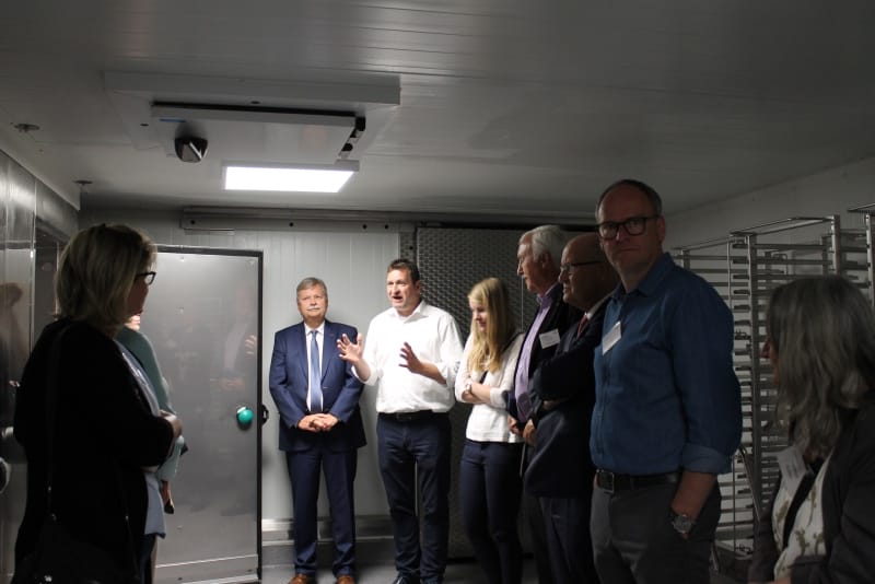 Anschließend konnte die Produktionsstätte besichtigt werden. Die Führung wurde so durchgeführt, wie der normale Prozess ist: von der Warenlieferung, Warenveräumung, erste Vorbereitung der Lebensmittel, über kalte Küche, warme Küche, Schockkühler, Kühllager, Kommissionierung, Warenausgang, Spülküche. Zum Schluss noch einen Ausflug ins Trockenlager.