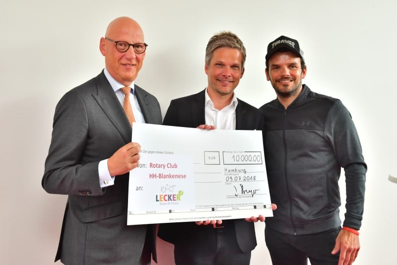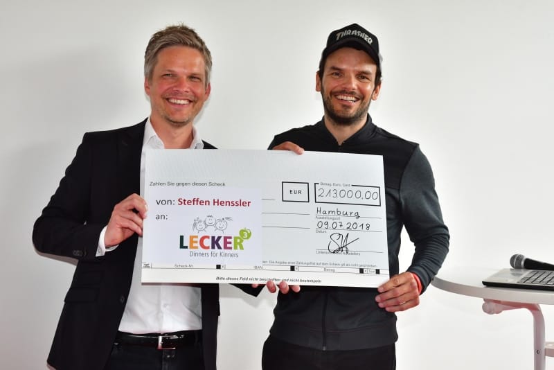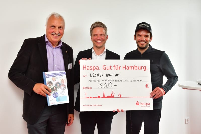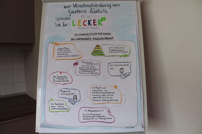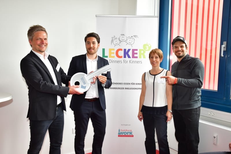 Dann kam der große Moment der Schlüsselübergabe durch den Vermieter und Förderer BEOS. Die Ausstattung der Küche ist von vielen Institutionen und Einzelpersonen enorm gefördert worden, so z.B. von der Aktion Mensch, vom Integrationsamt der Stadt Hamburg, von Firmen wie Profitabel, Schwarz&Grantz, Hagatec, MKN und dem Kooperationspartner Bösch Boden Spies, von der Scheck-Stiftung und vom Rotary Club Blankenese, vom Freundes- und Förderverein der Pestalozzi-Stiftung Hamburg und ganz aktuell noch von Gudrun Lüdicke vom Kirchenkreis Hamburg-Ost. Sie scheidet aus dem Berufsleben aus und verzichtet auf Abschiedsgeschenke; stattdessen bittet sie um Spenden für den Betrieb und hat dafür ein Plakat gezeichnet und aufgehängt. Der größte Dank gebürt wohl unserem Schirmherrn Steffen Henssler, der über seine Sendungen insgesamt 213.000 Euro an Spenden eingesammelt hat und mit seiner Medienpräsenz sehr öffentlichkeitswirksam für Lecker hoch drei ist.